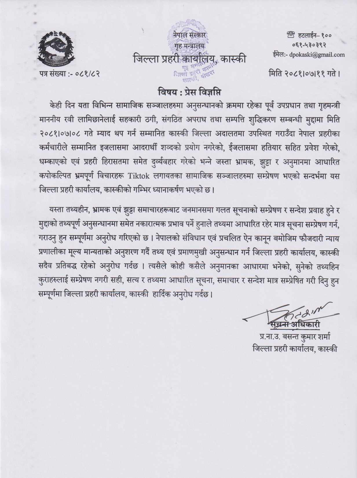 अदालतमा उपस्थित गराउँदा नेपाल प्रहरीका कर्मचारीले सम्मानित इजलासमा आदरार्थी शब्दको प्रयोग नगरेको, इजलासमा हतियार सहित प्रवेश गरेको, धम्काएको एवं प्रहरी हिरासतमा समेत दुर्व्यवहार गरेको भन्ने जस्ता भ्रामक, झुट्टा र अनुमानमा आधारित कपोकल्पित भ्रमपूर्ण विचारहरू टिकटकलगायतका सामाजिक सञ्जालहरुमा सम्प्रेषण भएको सन्दर्भमा यस जिल्ला प्रहरी कार्यालय, कास्कीको गम्भिर ध्यानाकर्षण भएको छ कास्की प्रहरीले जारी गरेको विज्ञप्तिमा भनिएको छ।