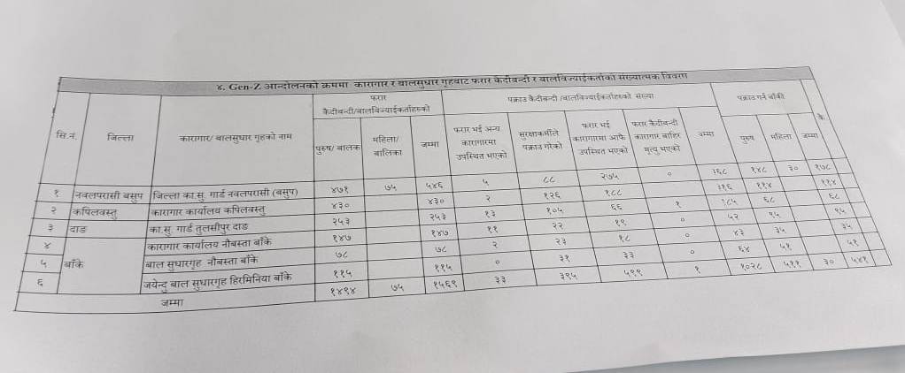 गत भदौमा भएको जेनजी आन्दोलनका क्रममा लुम्बिनी प्रदेशका विभिन्न कारागार तथा बाल सुधार गृहबाट फरार रहेका कैदीबन्दीमध्ये अधिकांश पुनः फर्किसके पनि पाँच सयभन्दा बढी बेपत्ता अवस्थामै छन् ।